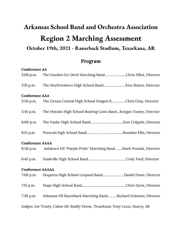 On Tuesday, October 19, the Arkansas High School Band will host and perform in the Region 2 Marching Assessment Competition. Eleven high school bands from the southwest region of the state of Arkansas will be representing their schools at the event.