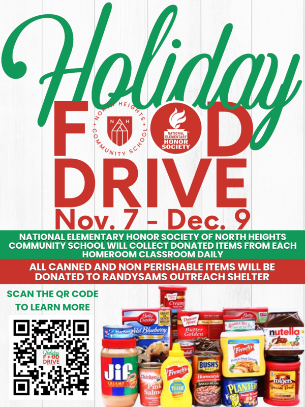 North Heights Community School's National Elementary Honor Society is collecting canned and non-perishable food items for Randy Sams Outreach Shelter from Monday, November 7 to Friday, December 9. Please bring canned and nonperishable food to your homeroom class.